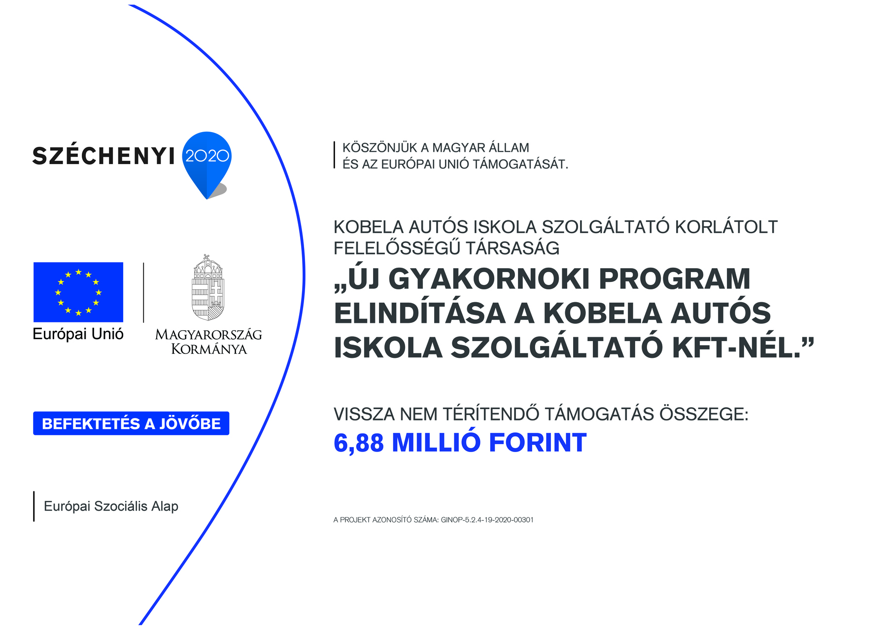 Projekt tartalma: A Kobela Autósiskola állandó bővítéseken és fejlesztéseken megy keresztül. Ez a megnövekedett piaci igény olyan többletszolgáltatásokat fog jelenteni a vállalkozás számára, amely többlet humánerőforrás alkalmazását tette szükségessé. A gyakornoki programba való belépés, azaz a fő iskolarendszerű oktatásból kilépő, 25 év alatti új munkavállaló alkalmazását, és egyben betanítását, valamint a versenyszférában való későbbi elhelyezkedést segítő és erre felkészítését tette lehetővé éppen ezen humánerőforrás többlet biztosítása. A 2 fő gyakornoki munkavállaló felvételével így lehetőség nyílik ezen munkafolyamatok elvégzésére. Erre biztosíték a vállalkozás ügyvezetőjének személye, aki ezen a területen már több mint 10 éve tevékenykedni, aki egyben a projekt során a vállalati gyakornoki kapcsolattartó feladatait is ellátta, a projekt során 3-szori alkalommal a Szakcentrummal, illetve munkaidejéből heti 10 óra gyakornoki kapcsolattartással, képzéssel, és tanácsadással(felügyelettel). A gyakornokok felvétele mellett eszköz/gépbeszerzés is a projekt másik tartópillére (1 db MR08 Mini forgó kotró), amely a gyakornokok munkáját segíti úgy, hogy az adminisztratív tevékenységek mellett lehetőség lesz ezen gép vonatkozásában is oktatói/képzési feladatok ellátására.
